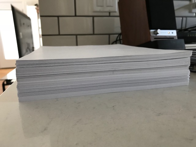 Then I got a call from Muse Margaret who was pleased with the last forty-seven pages and liked the way everything played out. She only had one small thing and she wasn’t even insistent about it – but we looked at it together and I decided she was right about it, even though it was very slight – just a little too much gilding the lily in terms of a description, so I just deleted the four words in that sentence, and the same four words in a subsequent section. And she liked the ending that I used rather than the alternate. So, that was that and I was very happy with the call. Then I watched a bit of Sayonara on Blu and Ray. After that, I just relaxed and listened to music. Here’s what 295 manuscript pages looks like as photographed by my iPhone.