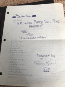 But the most intriguing thing of the day was being contacted on the Facebook by a nice lady, who told me she had some note I’d written to someone named Babs Klein. I had no idea what she was talking about. She asked if I’d like to have it. So, I wrote her back and said I was intrigued. She gave me her number, but first she texted me a jpg of the note. And there it was – in my teenage handwriting I’d written Babs Klein a cute note and included the lyrics to my song “I’m in Like With You,” which is the first song I ever wrote. So, this had to be somewhere around 1963, I should think, because I don’t know why I would put that lyric any later than that. I don’t think it was earlier than 1963 but I just have no way of knowing. Now, I have a vague memory of a Barbara that I think I either liked or went out with at some point. Why I would call her Babs is anyone’s guess. It’s a real mystery. I remember most of the gals I liked back then, including my first girlfriend Esther, and dear readers Jane and Jeanne. And I remember well a girl named Karen Belsky, although that may have been earlier, and I remember, of course, Stephanie Gorman, who is the subject of Kritzer Time. But Barbara Klein is a hazy thing and I can’t figure out why given the tenor of this note. But I thought all you dear readers out there in the dark might enjoy seeing it, and how brazen a young teen I was in those days.