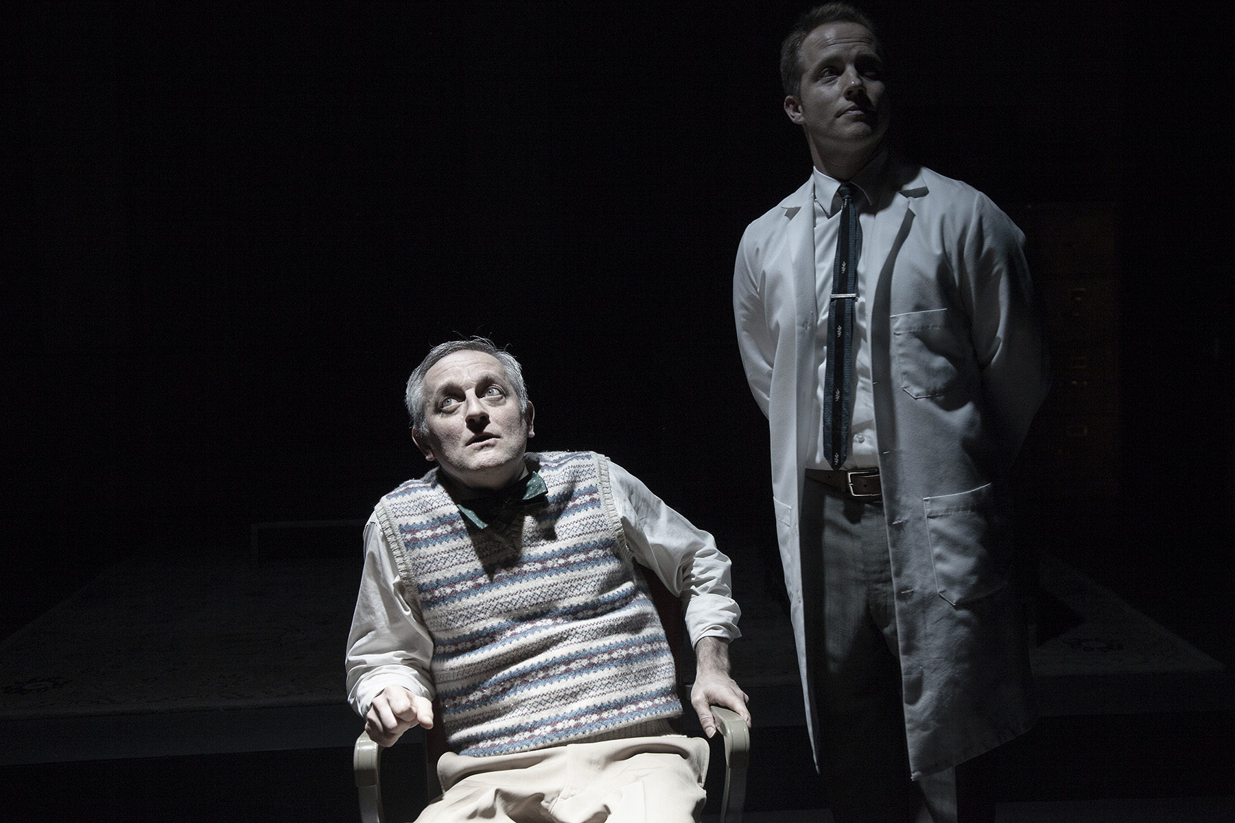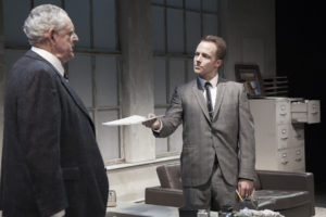 It’s Christmas Day but it seems it is no holiday for the staff. Roote (a blustering Peter Van Norden) is the titular man in charge of the facility but he doesn’t seem too sharp or tuned into the goings on. His assistant Gibbs (a slick and polished Graham Hamilton) is a very smooth operator and has his finger on the pulse of the institution and is fiendishly grasping for total control. The two of them share Miss Cutts (Jocelyn Towne as the usual icy Pinter seductress) as both secretary and mistress. The main occupation of Lush (a finely tuned comic performance by Rob Nagle) seems to be imbibing Roote’s liquor as the two get sloshingly drunk. The meek little staffer Lamb (JD Cullum) seems to be the only conscientious employee and he soon ends up being tortured and straight-jacketed by Gibbs and Cutts. The madness escalates to a bloody massacre off stage and a change in command.