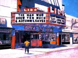 I got him out to LA when we recorded The Fantasticks in Jazz and we supped then, too. By then he’d finally moved to Tomball, Texas, where he had a house. When I finished Benjamin Kritzer late in 2001 I instantly called him and asked him to do the cover art – there was no other thought in my mind. He hesitated not a second, and asked me to send him a photo of the movie theater I wanted on the cover and I did and all I said was “put a young me in front of the theater.” He told me he couldn’t promise me when it would come, but about a month later I got a Xerox of the marquee portion of the theater and it looked great – a tease which he took some delight in. Then about three months later the package with the painting arrived. I unwrapped it and almost literally fainted when I saw what he’d done – it literally deprived me of breath it was so stunningly beautiful. And as lovely as it is on the cover of the book, it’s nothing compared to what it is in person. It’s like going back in time and actually being there. I called him and told him that it was absolutely perfect and he was so pleased. It was beautifully inscribed to me – sadly, you can’t really read it anymore as the ink he used faded – you can see the “To Bruce” and the “H” he signed it with, but not the actual inscription. I do think I have a photo of it taken when I got it and I’m sure it’s visible in that. Here’s that painting.