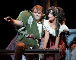 Will North does a credible job of portraying Quasimodo as he scampers all over the multi-level set (uncredited in the program but actually designed by Stephen Gifford in 2016 and seen in all its splendid glory in La Mirada). He is in fine voice for “Out There” and other numbers, but his performance in mostly surface, not much subtext. Adam Hollick manages to give some depth to Phoebus, the boy toy of the Gypsies, tramps and thieves. John Michael Wilcox displays a lot of energy as Clopin, King of the Gypsies and the teller of the tale.