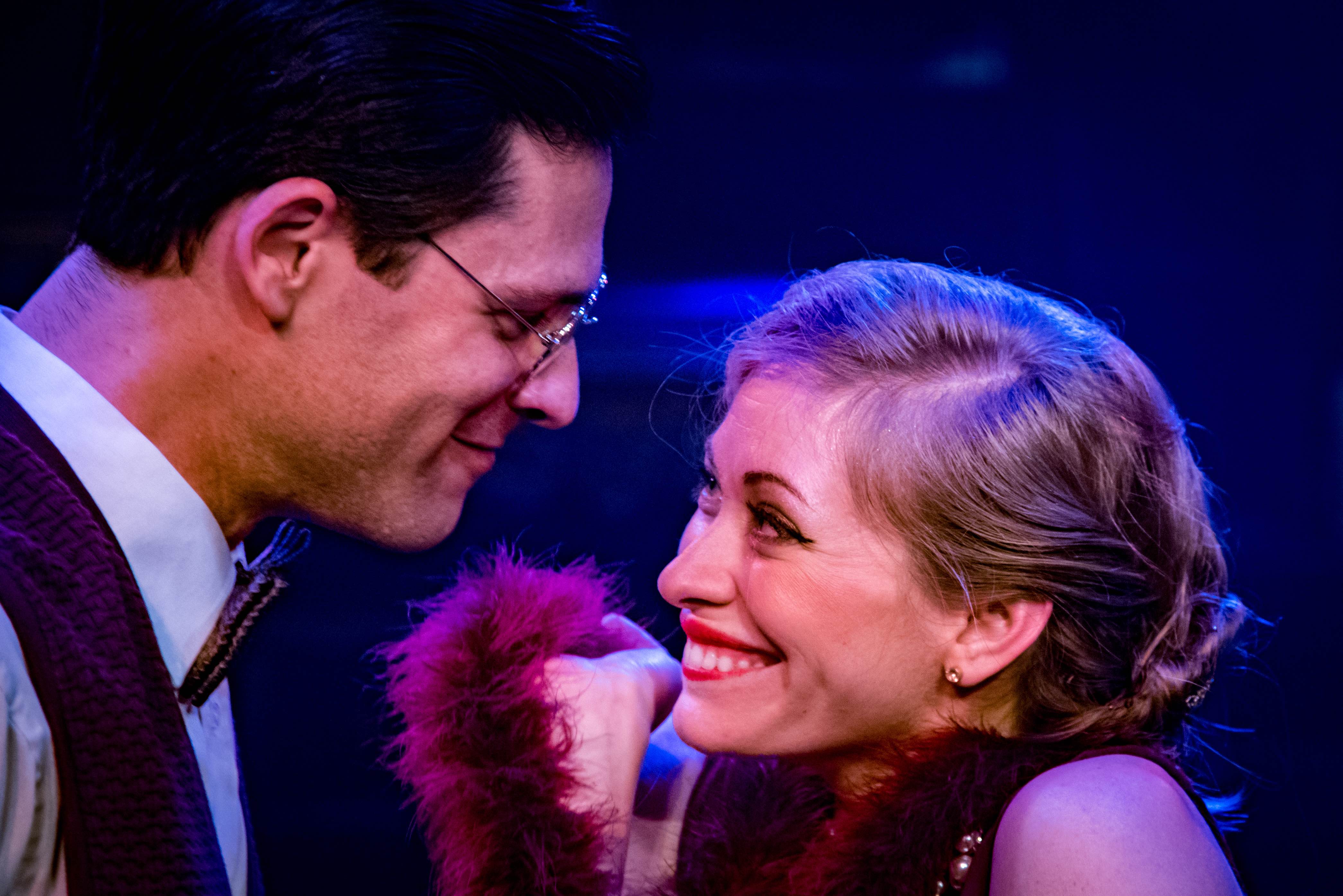 Scenic designer Stephen Gifford has turned the intimate playing space into the cramped yet comfy confines of Berlin’s Kit Kat Klub, even seating four couples at small tables in the playing area where they function as the Klub’s audience. The band is situated high above the action, hovering over the stage that forms the back wall of the set. That stage set is chock full of furniture pieces and props that are put into play when needed. Director Michael Matthews has staged some action in the theatre’s entranceway, using every inch of floor space available to him. He has mined this rich and overworked material, discovering new gems of insight into the characters and songs. Choreographer Janet Roston once again worked her magic as she put the leads and the very talented troupe of six chorus members (Jasmine Ejan, Tristan McIntyre, Sarah Mullis, Tanner Rampton, Nicole Stouffer and Mary Ann Welshans) through some very complicated and energetic dance moves on a postage stamp playing space.