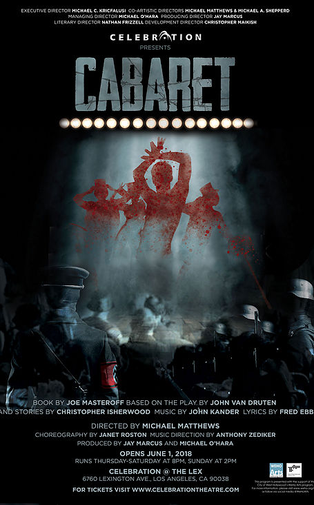 Christopher Isherwood’s 1945 novel Berlin Stories was turned into a Broadway play called I Am A Camera in 1951 and later filmed, both starring a young Julie Harris as the desperate to be decadent cabaret performer Sally Bowles in 1930s Berlin. Playwright Joseph Masterhoff and the composing team of Kander & Ebb turned it into a Tony Award winning musical entitled Cabaret in 1966. Bob Fosse won an Oscar for directing the classic 1972 film version which also won Oscars for Liza Minnelli’s Sally and Joel Grey’s Emcee along with wins in five other categories. A 1998 Broadway revival incorporated some other Kander & Ebb songs used in the film while jettisoning a few of the original tunes. This version, which originated at London’s Donmar Warehouse, also sexed up the book, especially leading man Cliff’s bisexuality. There have been many local productions over the years in theatres both big and small including one produced by McCoy Rigby Entertainment earlier this year in La Mirada. The tiny Celebration Theatre in Hollywood has just opened what is nearly an immersive staging and is most definitely an unforgettable production that any theatre aficionado cannot afford to miss.