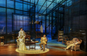 Richard Eyre has directed with a strong, sure hand and his quintet of actors all deliver lived in performances. You soon forget you are watching actors in a play, feeling like you are watching a very tragic family come slowly apart at the seams. Rob Howell’s set design is all glass and mirror walls and ceiling. The actors’ reflections highlight the sense of paranoia that everyone is watching everyone else at all times. Mary especially feels this as her family hunkers down to await her total descent into her drug-addicted state. Jeremy Irons struts the stage like the egotistical actor he portrays; he seems to always be the focal point of every scene. Matthew Beard portrays the innate sensitivity embodied in Edmund, the youngest son, the budding poet with a touch of consumption. Rory Keenan as Jamie roars, struts and drinks like a carbon copy of the father he detests. Jessica Regan provides support in her one long scene with Mrs. Tyrone.