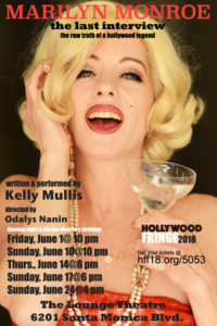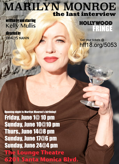 More than 55 years after her death, Marilyn Monroe is still the most famous celebrity in the world. Just check out the many souvenir shops on Hollywood Boulevard. There have been countless books written about the pre-eminent movie sex goddess of all time. Innumerable movies, television programs, plays and musicals have been written about her. Drag performers have imitated her. Madonna has imitated her. In Marilyn Monroe The Last Interview at the Hollywood Fringe Festival, writer/performer Kelly Mullis presents a very credible Marilyn, sexy and vulnerable, mature and childish–each facet within a hairs breath of another. She has Monroe’s look and sound, circa 1962, down perfectly. She also sings a few songs associated with Monroe throughout the show. Although the tag line for the show is “the raw truth of a Hollywood Legend,” there is not much new in the hour-long show. We again hear about Norma Jean’s stint in a series of foster homes, the insanity that ran in her family, her need to marry a Father Figure, or daddies as she called them, the effect of Lee and Paula Strasberg on her career. Her many love affairs from Joe DiMaggio and Arthur Miller through Yves Montand, Frank Sinatra and Jack Kennedy are recounted. The Kennedy fueled ending is the one fairly new element to the familiar saga.