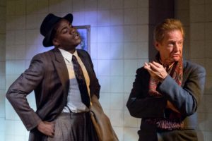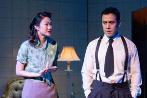 In Mexican Day, noted civil rights activist Bayard Rustin (Donathan Walters) comes out from New York to lead an effort to integrate the baths. In 1948 people of color were only allowed admission on “Mexican Day,” a day when the bath water was so filthy it would be emptied at the close of business. He finds a willing accomplice in Japanese American writer Hisaye Yamamoto (Jully Lee), who spent part of World War II in an internment camp. Even though she writes for a Negro newspaper, her editor does not condone her activist bent. Mexican gate keeper at the baths, Zenobio (Jonathan Medina) is caught between a rock and a hard place. He’s a decorated war hero but back at his job, he is compelled to enforce the rules and forbid admission to Rustin and Yamamoto. Rustin decides to enlist a white male to help their cause, but disgraced art historian turned screenwriter Everett Maxwell (Darrell Larson) has his own demons to face. He has been banned from the baths for decades and he has a past history with Zenobio that has left both men broken. Jacobson skillfully weaves all the various story threads into a moving piece of theatre, skillfully enacted by the quartet of actors under the deft direction of Jeff Liu. John Iacovelli designed the bathhouse setting complete with two turntables that easily transform to the various locales.