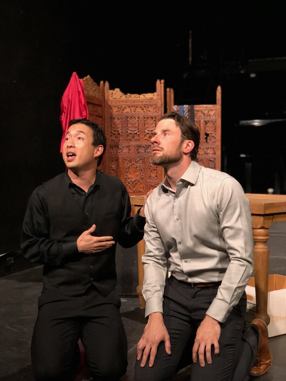 Hill’s book looks at the life-long friendship of the exuberant Alvin (Daniel Koh) and the more straight-laced and protective Thomas (Andrew Schufman). They are put together by their first-grade teacher at a Halloween costume day when Alvin, wearing his recently deceased mother’s fuzzy slippers and chenille bathrobe, is the only one to guess Thomas is dressed as Clarence, the angel from It’s a Wonderful Life. Thus starts a life-long tradition of spending Christmas Eve together, watching the movie indoors and making snow angels outdoors. Thomas is reminded of this and other memories of his long friendship with Alvin when he returns to deliver the eulogy at Alvin’s funeral. Thomas moves to a big city for college and become a famous writer of short stories, always encouraged by Alvin, who remains in their small hometown, taking care of his father and his father’s bookstore.