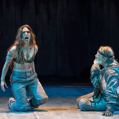 Not only has Rodriguez-Elliott created this modern, brutal setting and re-envisioned the trappings, she has elicited heartfelt and heart-rending performances from her cast of twelve (I counted them several times to make sure it was only an even dozen), many playing multiple roles as they partake in the play-acting. The triumvirate of leading performers is exceptional. Geoff Elliott enacts the childish joy of Quixote, always up for a quest or adventure to earn the good graces of his lady. He perfectly balances the comedy and drama of his three roles. His rendition of “The Impossible Dream” reaches for dramatic heights and attains them. Kasey Mahaffy delivers a fresh take on servant/friend Sancho. Usually played as a roly-poly comic relief character, Mahaffy offers true depth to the character and his relationship with his master/friend. Cassandra Marie Murphy scorches the stage with her performance as Aldonza, “the kitchen slut reeking with sweat.” Her fire, her anger, her ferocity start to melt away under Quixote’s kindness and affection. It is a truly beatific moment when she assumes the nobility that is the birthright of Quixote’s lady Dulcinea. Brava Diva!