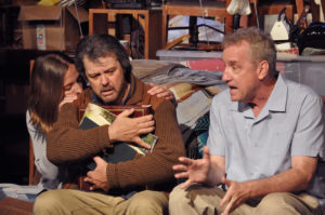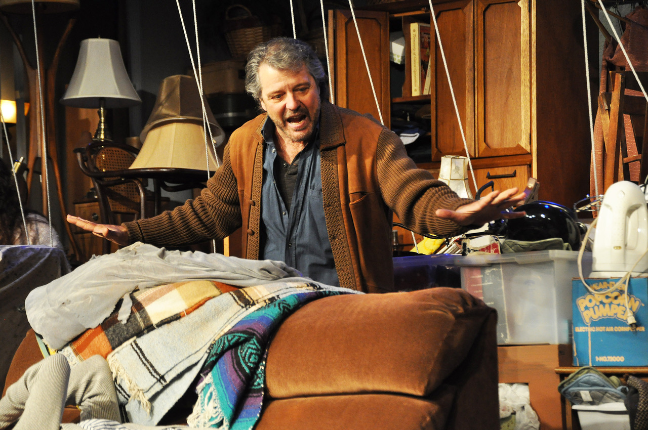 Newspapers are just one of the seemingly thousands of things that Barry (David Mingrino), the middle-aged hoarder and title character in Benjamin Scuglia’s new play The Man Who Saved Everything, collects in his overstuffed house. The overly cluttered scenic design by Evan A. Bartoletti is a character unto itself and unfortunately also the most interesting one in this 85-minute intermission-less World Premiere at Theatre West. The L.A. County Department of Mental Health Hoarding Fact Sheet included in my press kit was more informative than the play which is basically a kitchen sink family drama without the kitchen sink.