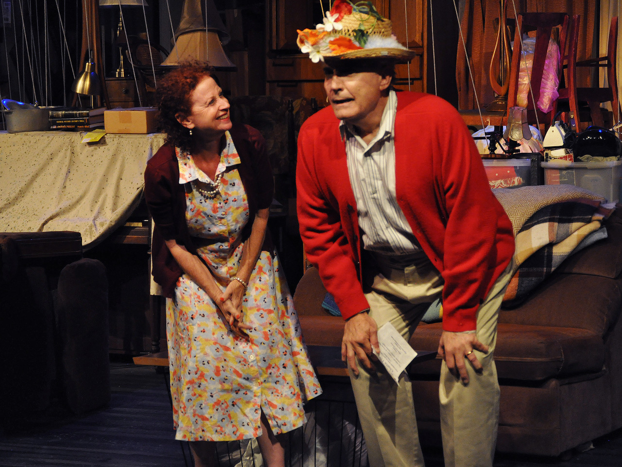 Barry’s home is about to be bulldozed to make way for a new mall; deconstruction has already started down the block. His niece Darla (Ashley Victoria Robinson) and an old college buddy Chuck (James J. Cox) both attempt to stage an intervention and convince Barry it’s time to move out. Barry collects things familiar to him; he collects to hold unto the memories. Memories of the father (Alan Schack) whose love he craved and never received and memories of the emasculating wife/mother (Julia Silverman) who always belittled both men. Why he would want to hold on to those memories is one of the many conundrums in Scuglia’s script. The acting is serviceable under Michael Van Duzer’s direction but even at 85 minutes the play feels repetitive and too long. The staging’s most innovative touch is The Collectibles (Ivy Miguel and Loida Navas), who act as always-on-view stagehands handling the many props. Their colorful costumes by Maxine Etchison are a highlight.