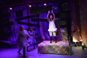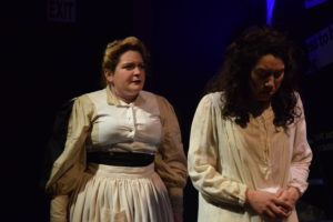 Iyer herself stars as Wendla, a sheltered young girl on the cusp of puberty and full of questions about what lies ahead for her. Her overly protective mother (played by Kris Robinson who brings variety to all the Adult Women she plays) still tries to convince her that babies are brought by storks. When finally confronted with Wendla’s repudiation of that myth, her mother says babies only occur in marriage, which leaves the still confused Wendla open to frenzied seduction, pregnancy, abortion and death. She has led such a sheltered life, at one point she bemoans the fact that she has “never felt anything” and asks to be whipped.