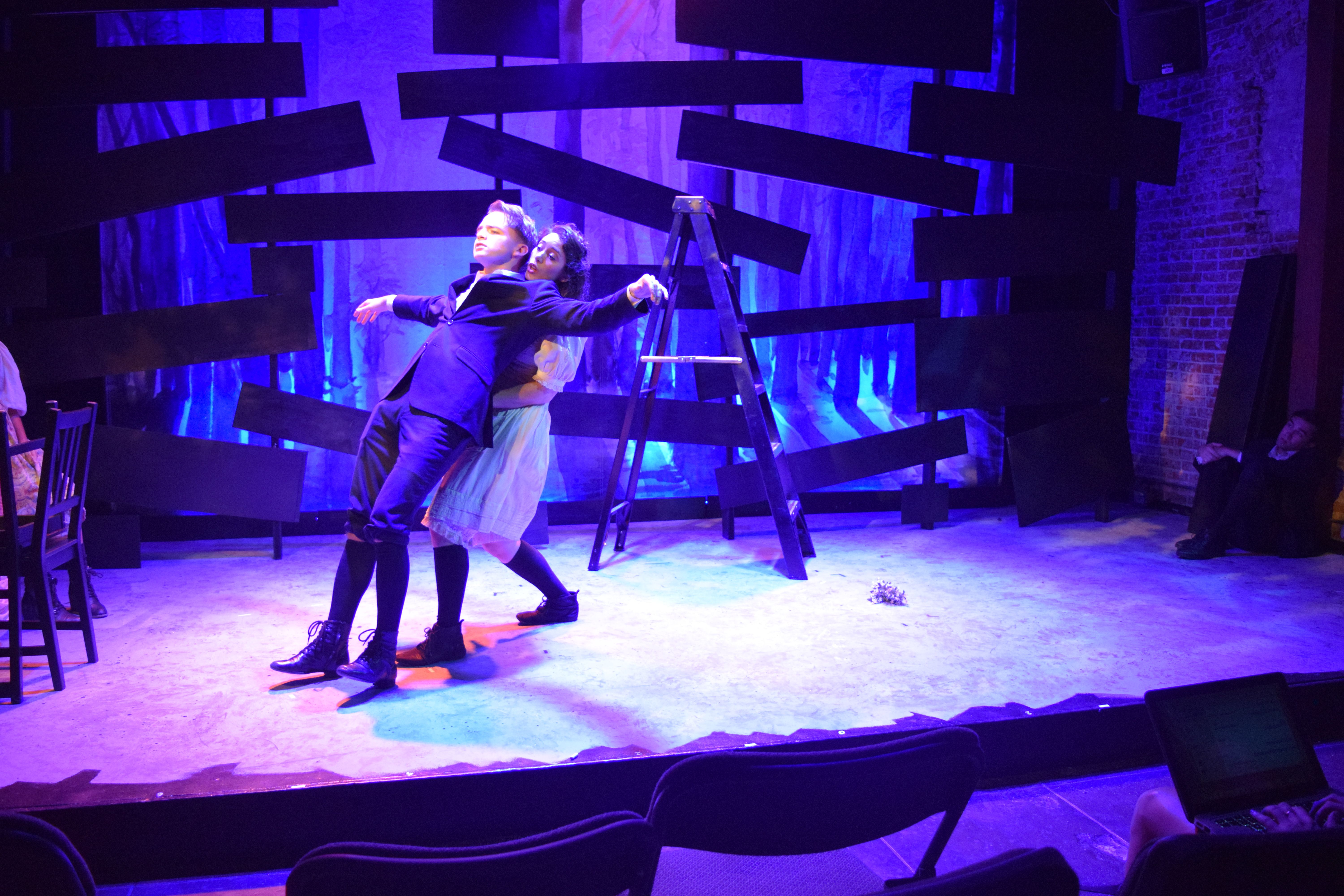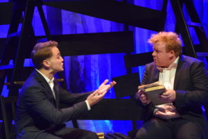 David Goldstein’s simple yet so very effective scenic design consists of a few chairs, a couple of ladders, a series of boards that are pulled off a wall and used for various tasks and then reattached. For the second act, the black masking is removed revealing startling facts of today’s political climate. Martha Carter has used the lighting like a master painter, creating one masterpiece of color scene after scene.