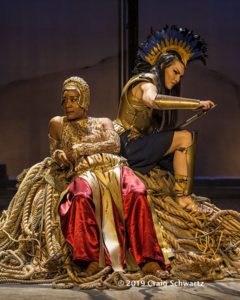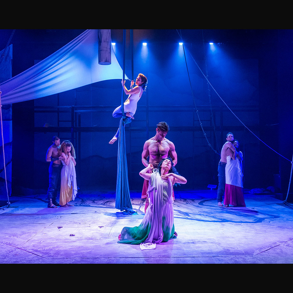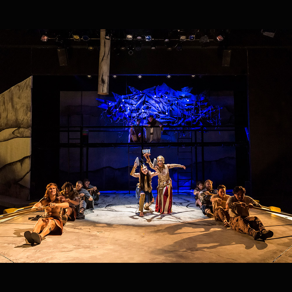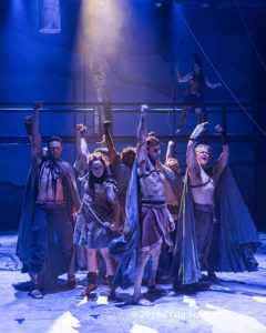 Zimmerman has creatively written the various adventures, imbuing many of them with plenty of humor. Rodriguez-Elliott has inventively staged this highly theatrical stage outing. The cast (which also includes Sam Christian, Justin Lawrence Barnes, Collin Bressie, Lorena Ruiz and Bradley Alan Turner) mostly play multiple roles, switching quickly from one character to the next. It’s a wonderfully meshed ensemble. Frederica Nascimento’s open and spare two-level scenic design gives plenty of space for the action to be staged. Jenny Foldenauer’s costumes and Shannon Hutchins’s wig & make-up designs are a key ingredient. Props Master Erin Walley and Associate Puppet Designer Dillon Nelson have created some magical moments. Ken Booth’s lighting heightens the mood. Robert Oriol’s original music and sound design are a truly valued character. Murphy lends her beautiful voice to several of the musical interludes, including “Women of Lemnos” which she sings while suspended from the rafters in silks a la Cirque du Soleil.