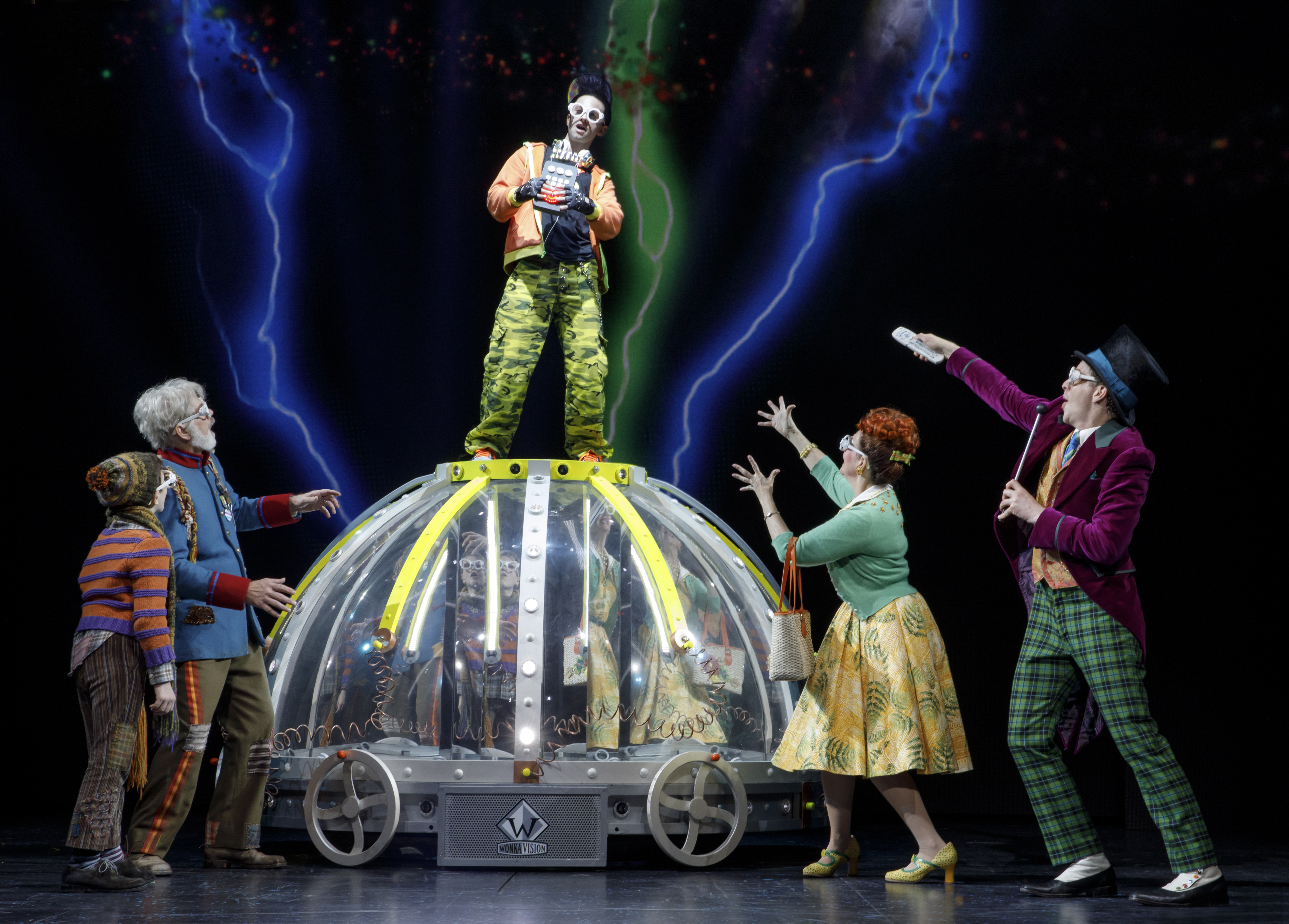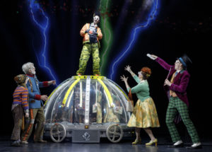 Charlie’s competition for a Golden Ticket and a tour of Wonka’s candy factory are four other children from around the world. The bratty children and their enabling parents are introduced as they are announced as Golden Ticket winners. They are the porky Augustus Gloop (Matt Wood) and his bratwurst wearing Mama (Kathy Fitzgerald) from Bavaria; the balletic Veruca (Jessica Cohen) has been given a nationality change from British to Russian as well as an oligarch father (Nathaniel Hackmann); the marathon gum chewer Violet (Brynn Williams) and her father (David Samuel) are given a Southern California hip hop makeover while TV and video game fanatic Mike Teavee (Daniel Quadrino) and his stuck-in-the-Fifties mom (Madeleine Doherty) are from Iowa. The first act introduces all of them as well as quirky Wonka (Noah Weisberg) and poverty stricken Charlie Bucket (Henry Boshart, Collin Jeffrey and Rueby Wood alternate in the role) and his double job working mom (Amanda Rose) and his four grandparents who must share a bed. The act runs just over an hour but feels at least twice as long given the stale writing combined with the static direction of Jack O’Brien.