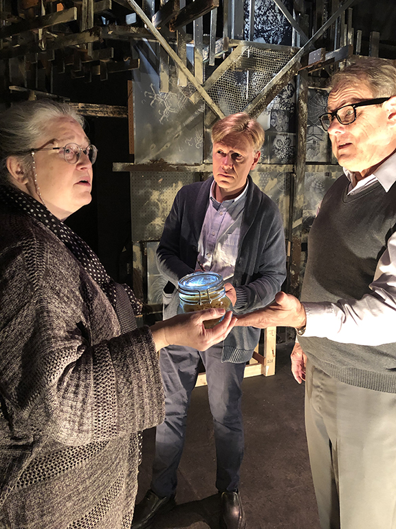 A cast of four talented actors, on stage for the entire 90-minute running time, play 21 different characters under the disciplined direction of Don Boughton. In scenes in which they do not participate, the actors blend into Mark Kanieff’s simple set design, becoming another part of the background. Alex Wells plays pathologist Thomas. His excitement over keeping Einstein’s brain in his cellar or the trunk of his car is exceeded only by the enthusiasm his wife Elouise (Debba Rofheart) displays at first. However Elouise soon sours on the brain, initiating a divorce and causing Thomas to begin his odyssey. Rofheart also plays Evelyn Einstein, thought to be the physicist’s granddaughter but in reality might be his daughter. An ambitious reporter (Dan Via) encourages a DNA test of the brain to find out. Via also plays Henry whose every encounter with his wife Margaret (Sarah Rosenberg) and his doctor (Wells) is a brand new experience. Rofheart also plays Brenda, a neuropsychologist with unknown ties to Henry, who after a long marriage and a grown son, is embarking on her first lesbian relationship.