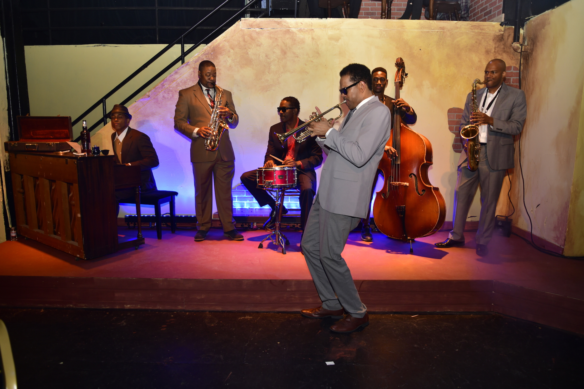 American jazz trumpeter, composer and bandleader Miles Davis is considered one of the most influential and acclaimed figures in the history of jazz. He led the Miles Davis Sextet, which also included jazz greats saxophonist John Coltrane and alto saxophonist “Cannonball” Adderly, which was a fixture at the New York City jazz club Birdland in the late 1950s. The Robey Theatre Company, celebrating its 25th anniversary presenting work reflecting the experiences of the Black diaspora, is presenting the World Premiere of Randy Ross’s Birdland Blue at the Los Angeles Theatre Center. The action all takes place on a hot, humid night in August, 1959 at Birdland as Davis struggles with many issues. Ross has packed a lot into his 90-minute one-act. Davis (Marcus Clark Oliver) is desperately trying to keep his band together. Both the ever more religious Coltrane (Jermaine Alexander) and fast-talking Adderly (Damon Rutledge) are planning on leaving to head their own groups. Davis is trying to keep young bassist Paul (Rogellio Douglas III) off drugs while also trying to keep himself clean. He’s forced to deal with club manager Mo (Charles Isen) who tries to cheat him of his fee while Mo is trying to keep corrupt police detective O’Brian (Darrel Phillip) from increasing his “protection fee”. In the midst of all that, Davis is also trying to seduce magazine interviewer Lucinda (Tiffany Coty), who may not be as upbeat as she says. It’s a jam packed night.