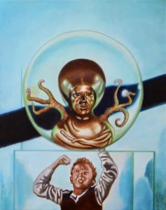 After that, I came right back to the Valley, stopped at home for a minute, then took a five-minute drive to have a little meeting with a nice fellow named L.J. Dopp. I’d seen him at the paperback show a few weeks ago – he sells his paintings (or prints from them), DVDs of movies he’s directed, and he’s written books, too. I jokingly said he should do a painting for me and since he needed a favor from me, so we made a tit for tat deal right then and there. He asked what I’d like and without hesitation, and I mean without hesitation, I said Invaders from Mars. He loved that idea. He’s done a lot of sci-fi paintings but had never thought to do that one. We talked about what it might include. He sent me a photo of the almost finished version a few days ago, I loved it, he put the finishing touches on it and I picked it up. First, we met about the favor I’ll be doing him and so that’s now in the works. The painting came out great. Here is the almost finished version – he just did a couple more smoothing out things and signed it.