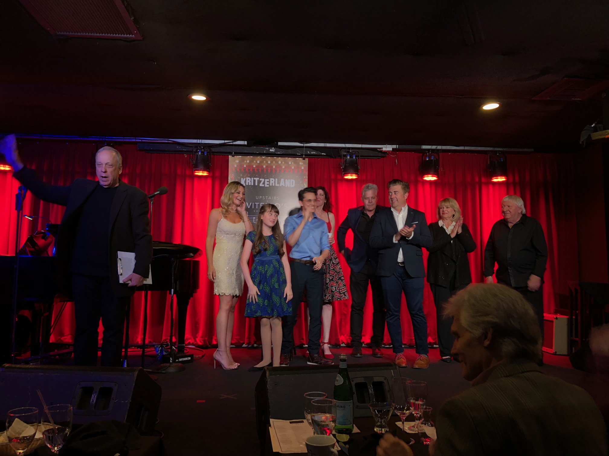 After that, I needed a sweet, so went to the bakery at Gelson’s and got a chocolate mousse thing, came home, and ate it all up, whilst listening to music and downloading some videos and photos from last night’s show. Here are a few.  Here’s our merry troupe right after the sing-along and just before its encore presentation.