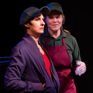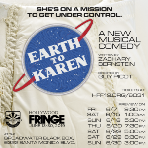 Zachary Bernstein has written a laugh-filled plot, some lively C&W infused tunes and some very clever lyrics making Earth to Karen a fun-filled outing. Guy Picot has deftly directed his talented quartet of performers while Bernstein musical directs and plays drums in the three-piece onstage band. The actors all create full-bodied characters and have strong singing voices. The scene stealer, usually in her Subway plastic gloves, is Van Kurin. Her every appearance generates laughs and Sarah M. Kruger’s choreography even gives her a chance to don her tap shoes to good effect. Earth to Karen attains lift off.
