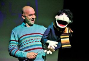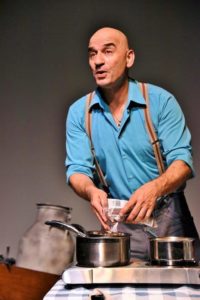 The result is the current World Premiere of his one-man show Five Pieces of Paper at the Hollywood Fringe Festival. Buchboot tells the story of his grandmother, a baker, who always had a sweet for him, to his father’s consternation. He tells the story through words and songs—including “My Yiddishe Momme”—using costumes, slides, newsreels and puppets. While telling her story, Buchboot also bakes (on a hot plate) Savta’s Chocolate Coconut Cake. The recipe is included in the program but the smell of the baking chocolate has the audience salivating in their seats. Luckily they each receive a piece at the show’s conclusion.