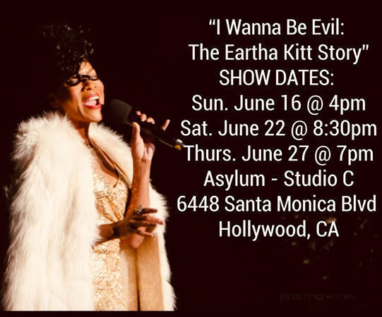 Writer, creator, executive producer and star Jenelle Lynn Randall recounts the highs and lows of Kitt’s life and career in her Hollywood Fringe Festival show I Wanna Be Evil: The Eartha Kitt Story. The show is done as a TV interview (conducted by Darrell Phillip) on the eve of Kitt’s opening night in Timbuktu! It’s a sobering as well as laugh-filled 50 minutes as Randall totally embodies Kitt, from rolling her R’s as if they were tires to sensually playing with the men in the audience as well as her interviewer. Randall has perfected Kitt’s vocal inflections and her sinuous moves and it’s like seeing Eartha reborn.