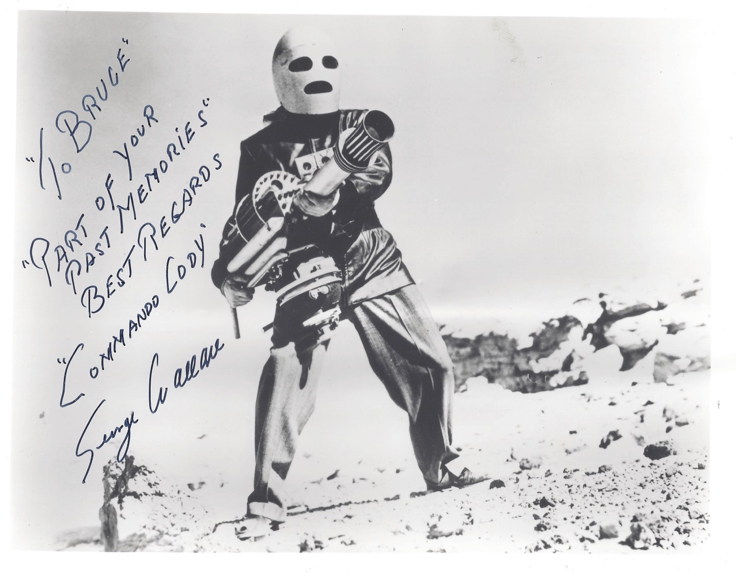 You all know that I’m a Commando Cody freak and have been since I was a little boy – it’s all in Benjamin Kritzer. I was working with Jane A. Johnston on something back in 2004, probably a benefit or something, can’t remember now, but she arrived with her husband, George Wallace – Commando Cody himself. I told him how much I loved that serial when I was a kid, so he went to the car and returned with this signed photograph. He died about seven months later.