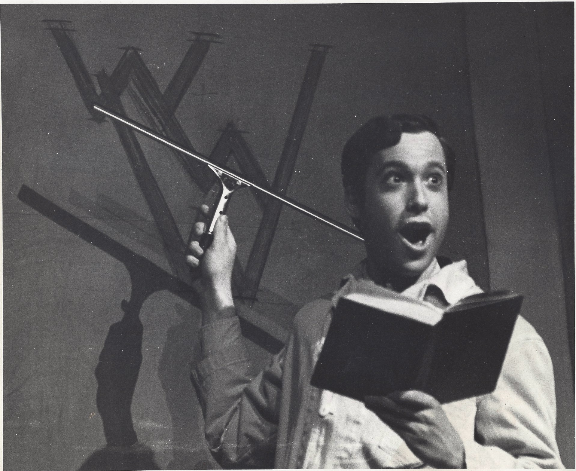 Another show I loved that I got to do was How to Succeed in Business Without Really Trying. I played Finch. Here I am, just starting to sing the title song after having been lowered from the flies on a window washing thing – I hate heights and they would have to fly me up there five minutes before curtain.