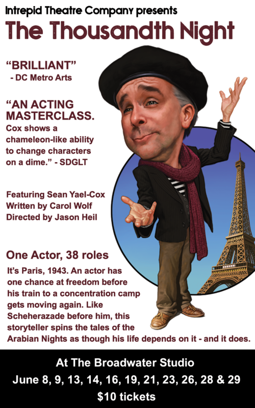 In March, 1943 the occupied French government was assisting their Nazi conquerors in deporting Jews and subversives out of France to “slave labor camps” in the East. French actor Guy de Bonheur finds himself at a train station 50 miles east of Paris. The Resistance has bombed the train tracks ahead so his train to the East has been delayed. Somehow he has managed to out maneuver his guards and he has taken refuge inside, hoping for some warmth. He finds a room full of French gendarmes (the audience) and pleads his case for clemency. The Gestapo officer who arrested him in Paris has it all wrong. He’s just an actor and the plays he participates in aren’t subversive. Here, let him show you a few. He’ll have to act all the roles since some of the actors in his theatre company were Jews and were taken away while others were found to be working for the Resistance and been arrested and tortured. Guy, ever more desperate, like Scheherazade in one of the stories he tells, spins more and more stories to keep himself alive and off that train. Stories from the Arabian Nights—tales of Ali Baba, the fisherman and the genie, etc. Carol Wolf has written a wonderfully inventive tale of her own with The Thousandth Night, incorporating all these elements. Director Jason Heil has deftly kept the pace ever moving forward, with nary a chance for Guy to catch his breath. Their leading man, Sean Yael-Cox masterfully spins the tales, entertaining and expertly switching from character to character with the addition of a piece of clothing or a hat. The tales grow slightly more subversive as Guy realizes his hopes of finding a savior grow ever bleaker.