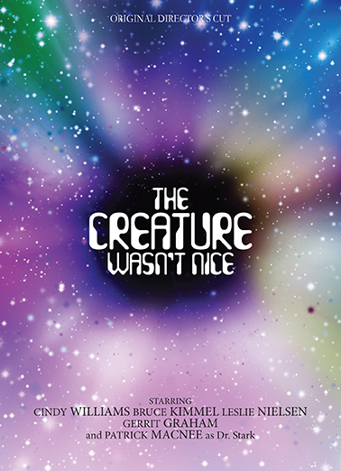 Well, dear readers, without further ado, not that we had any ado prior to this, so I’m not sure what further has to do with the price of fatty meats, but without any ado whatsoever, although we could say there’s a to-do rather than ado, oh, now I’ve lost the thread of what the HELL I’m talking about because I got distracted, not by the usual King of Distraction, but by my very own self – hmmm, what WAS I going on about? Oh, yes, without further ado let us make a to-do because the world premiere of the director’s cut of The Creature Wasn’t Nice DVD is now available for pre-order, with or without ado or to-do or ta da. What a moment this is. I know most of our regular discussion board dear readers took advantage of getting this via the Indiegogo campaign, but for anyone who didn’t grab it there, you can now grab it on the Kritzerland site, where it is now live. So, without further ado, and with much ado about something, here is the actual cover of the actual DVD.