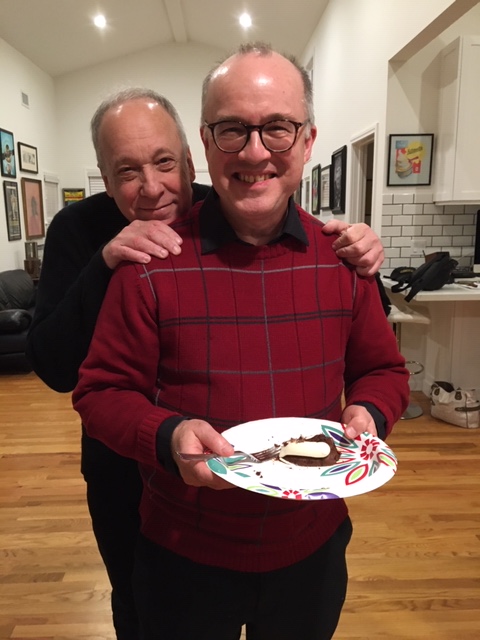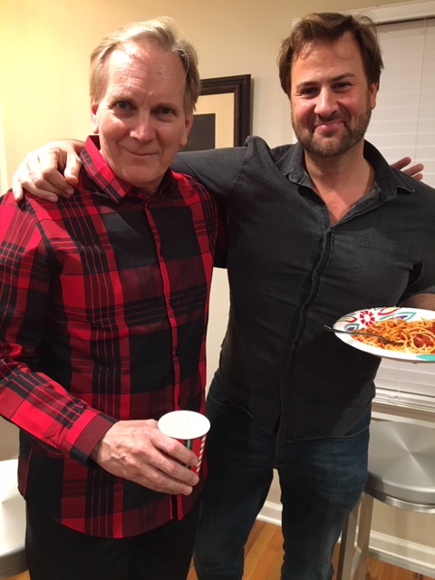 After everyone left, I put all the folding chairs away and cleaned up everything but the sauce pot and pasta pot. I had a bit more spaghetti (I’d only had one tiny helping) and a bit more tuna pasta salad. I used willpower to not have more desserts, although I’d only had a sliver of the peanut butter pie, which was extremely yummilicious. I sat on my couch like so much fish and watched more of the thriller And Soon the Darkenss, starring Pamela Franklin, which I’ll have more to say about after I’ve finished it. Then it was time to write these here notes. But before we get to today’s business, how about some Do photographs. Here’s Alby Potts and li’l ol’ me with new haircut.