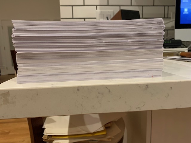 After that, I came right home and finished futzing and finessing about thirty minutes ago. I then began printing out the pages, which, given the number of pages, takes quite a bit of time. Whilst the printing is going on, I am writing these here notes, in case you couldn’t tell, as well as listening to more music by the marvelous composer, Geirr Tveitt – actually, the first music I’ve listened to for three days, which is a bit unusual, as you know. And here is a photograph of the 622 page stack.