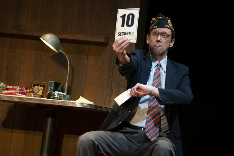 As a 15-year old, Schreck traveled the country competing in debates about the Constitution sponsored by local American Legion posts. She often won the cash prize, enough to pay her way through college. Schreck has basically written a monologue but with too many interruptions and tangents. In might have played better on Broadway where Schreck told her own story. At the Taper, we have an actress, Maria Dizzia, playing Schreck. She at times steps out of the Schreck character to add her own commentary. Mike Iveson, who plays an American Legion host and timekeeper, eventually steps out of that character to tell his own specifics. And then an actual 15-year old (Rosdely Ciprian alternating with Jocelyn Shek) appears and debates the Schreck character or is it the actress she debates; by then it is so muddled it doesn’t really make sense, it just adds to the running time. At nearly two hours with no intermission, it is a long sit, although ushers do reward you for your endurance with your own pocket copy of the Constitution.