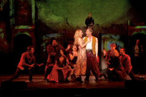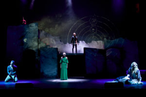 A lot of money has been spent on the production. Nick Iwaskow’s scenic design gives the appearance of a dark and forbidding castle. His and John A. Garofalo’s lighting design is top notch as is Leon Rothenberg & Jonathan A. Burke’s sound design. Mylette Nora’s costumes are a blend of traditional mixed with eye-popping punk style. The nine-piece orchestra conducted by music director Doug Oberhamer really does rock the score. The cast of 16 all prove to possess strong voices, several displaying rock ‘n’ roll sass as well as operatic power. Payson Lewis (Hamlet), Kevin Bailey (Claudius), Carly Thomas Smith (Gertrude), Ian Littleworth (Laertes) and Fatima El-Bashir (Ophelia) lead the cast.