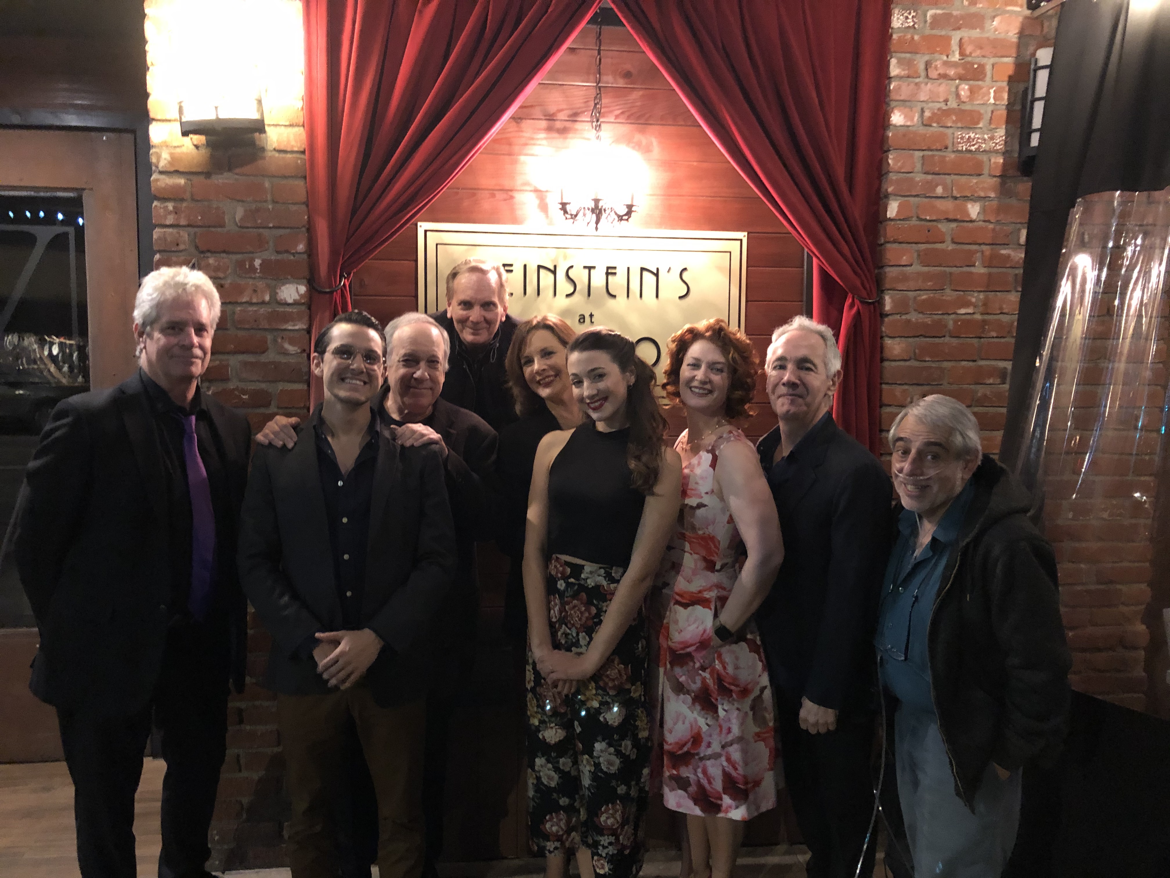 Prior to that, I happily got nine hours of sleep. Once up, I just relaxed and rested my voice and listened to music. Then I got ready – shaved and showered – after which I moseyed on over to Vitello’s for sound check. As I always do before the show, I had a small Caesar. I gabbed with a lot of folks after the show. The Shermans were with us, so that’s always fun, Barry Pearl and his ever-lovin’ Cindy, Peyton and her mom, former neighbors Tony and Bob, plus our own Amy and Mark, Howard Green from Disney brought a huge party of fourteen, and lots o’ others. Then the Yacko fellow and I went downstairs and had a proper meal. I didn’t know they had carbonara so I had that and it was excellent, I must say. We yakked for an hour or so, then I stopped at a mini-market and got something sweet, came home, ate a little bit of the sweet (chocolate covered almonds and raisins) and that was that. Here’s our merry troupe.