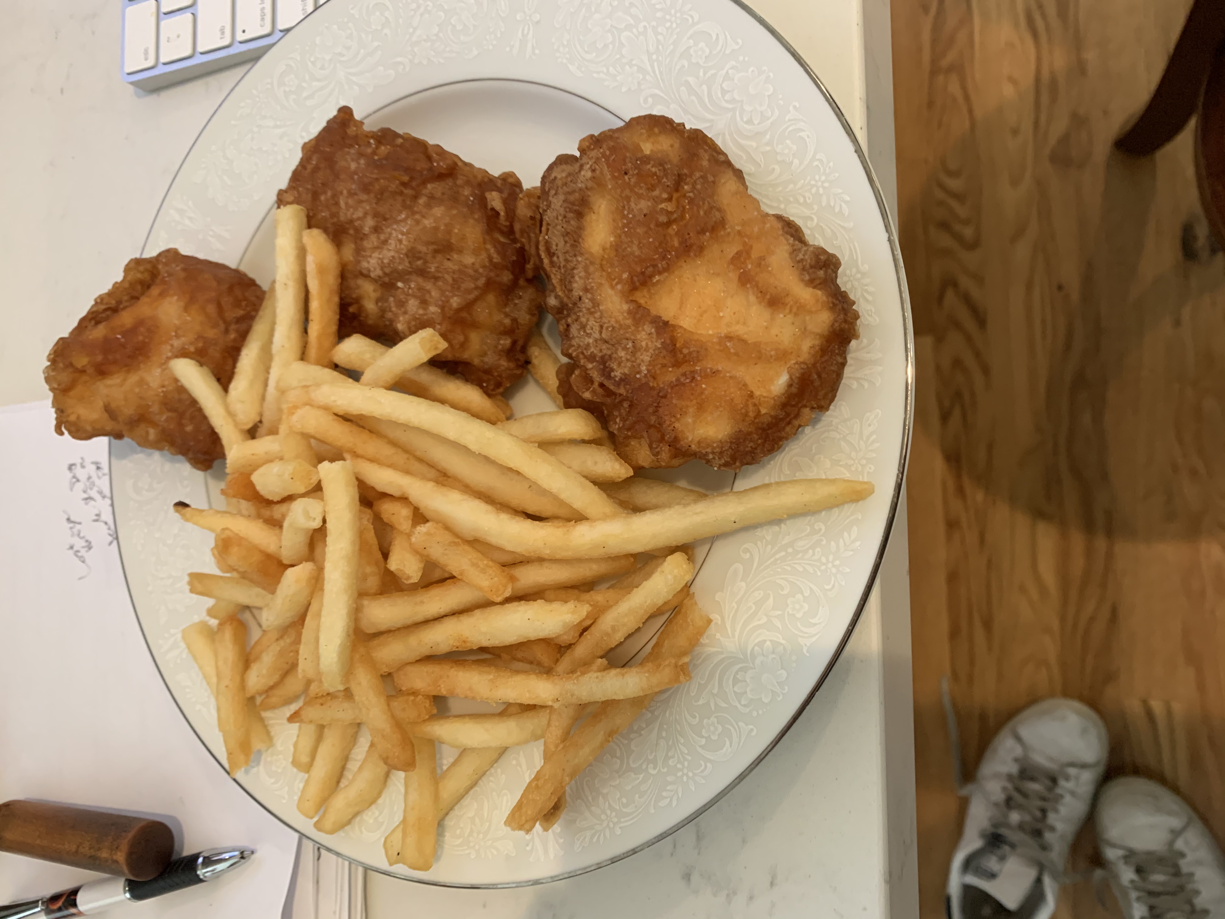 Well, dear readers, it is late and I am still sitting here like so much fish, not having written a word of these here notes because I had to fix something and I decided to get it out of the way and it took a bit longer than I thought it would. And so, without further ado, not that we’ve had any ado up to this point, here are the notes in all their naked glory. Can notes have naked glory? Nude notes? I’m liking the idea of unclad notes, aren’t you? After all, if people can let it all hang out, nudity-wise, why can’t notes? Why can’t these here notes just lose their inhibition and just show themselves as they are? In other news, I reek of garlic and I’ll tell you why and it has nothing to do with naked/nude notes. I reek of garlic because yesterday I had a treat meal because the day before had been non-stop and I felt I deserved a damn fine meal. So, I had the Smokehouse delivered via Door Dash. I knew it was a chancy thing to do, because it’s a fifteen-minute drive, but it was fine – another ten minutes would have rendered everything tepid, so it got here just in time – ooh, a Jule Styne/Comden and Green reference. Anyway, you see where this is going, don’t you? I had my beloved fish and chips and they were mighty fine, and I also had the half-order of garlic cheese bread, hence the reeking of garlic. So, I currently reek of garlic and am writing notes in all their naked, unclad glory. Wait! By George and by gum and buy bonds, I’ve got it! The First Nudie Notes. I think we’re onto something here. Here is the photographic proof of the food.