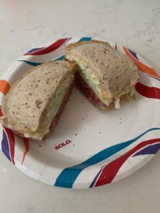 Yesterday seemed like a Tuesday to me, which is good since it was, in fact, Tuesday.  I got nine hours of sleep, which I needed, got up, did stuff that needed doing, did some Kritzerland show stuff (not just for the upcoming August show, but for the big tenth anniversary September show – I’ve set two fun guests so far.  I’d ordered food the night before from Daugher’s Deli, having loved my first experience there – Daughter being the daughter of the owner of Langer’s Deli.  This time I ordered their classic lean pastrami on double baked rye bread, with Swiss cheese, coleslaw, and Russian dressing, and I got an extra side of potato salad rather than the more caloric potato pancakes.  It arrived right on time at two o’clock.  It’s a bit too far for it to arrive really hot, but boy was it great – just a perfect sandwich that I ate all up.  I had a sweet leftover from the night before, a tiny slice of chocolate mousse cake and I had that, too, and it was very good.  Then I had to do the fly dance and we all know how that ended.  Oh, this time there is photographic evidence of the sandwich and here it is for your mental delectation.