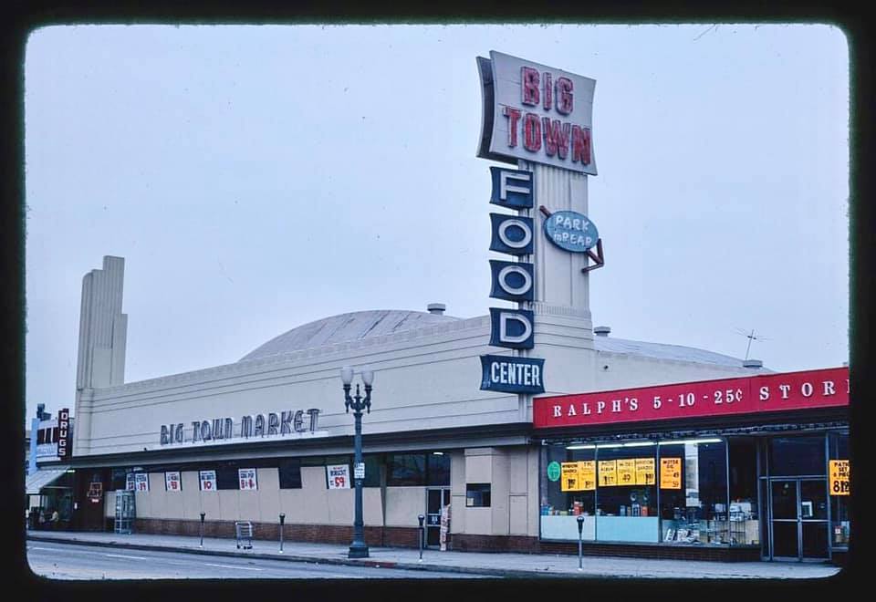 Oh, and speaking of nostalgia, I’ve been meaning to share this wonderful photograph, the first I’ve ever seen of this market and the store next to it. If you’ve read the Kritzer books, and who hasn’t, you know that I spent a good deal of my childhood going to Big Town Market and the Ralph’s Five-and-Dime next door (you actually could enter the five-and-dime through the market). Big Town is where I had my very first slice of pizza and I still remember that taste and watching the guy spin the dough in the air. If you were to enter the market via these front doors, the pizza place was literally to your right as you walked in. The only thing missing from this photo, which is clearly from the 1960s, is the mechanical horse that used to be to the left of the front doors, which I rode many times.