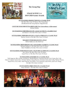 Yesterday, I woke up at nine after five not enough hours of sleep, went back to bed at ten, fell asleep around ten-thirty, and woke up at one, so I think that’s eight hours. Once up, I checked the pile of e-mails and the first one I came upon was a good one: The Scenie Awards from a local LA critic were announced, really for less than half a season of shows. There are mostly a lot of categories with multiple winners in each category. And The Man Who Came to Dinner won quite a few awards and good awards at that, and I won for best director of a classic play, my second Scenie directing award and I think my third personal Scenie (I won last year for best music and lyrics for A Carol Christmas). And one of our In My Mind’s Eye actors also won, so that was nice. Doug Haverty did a little flyer, so you can see what we won.