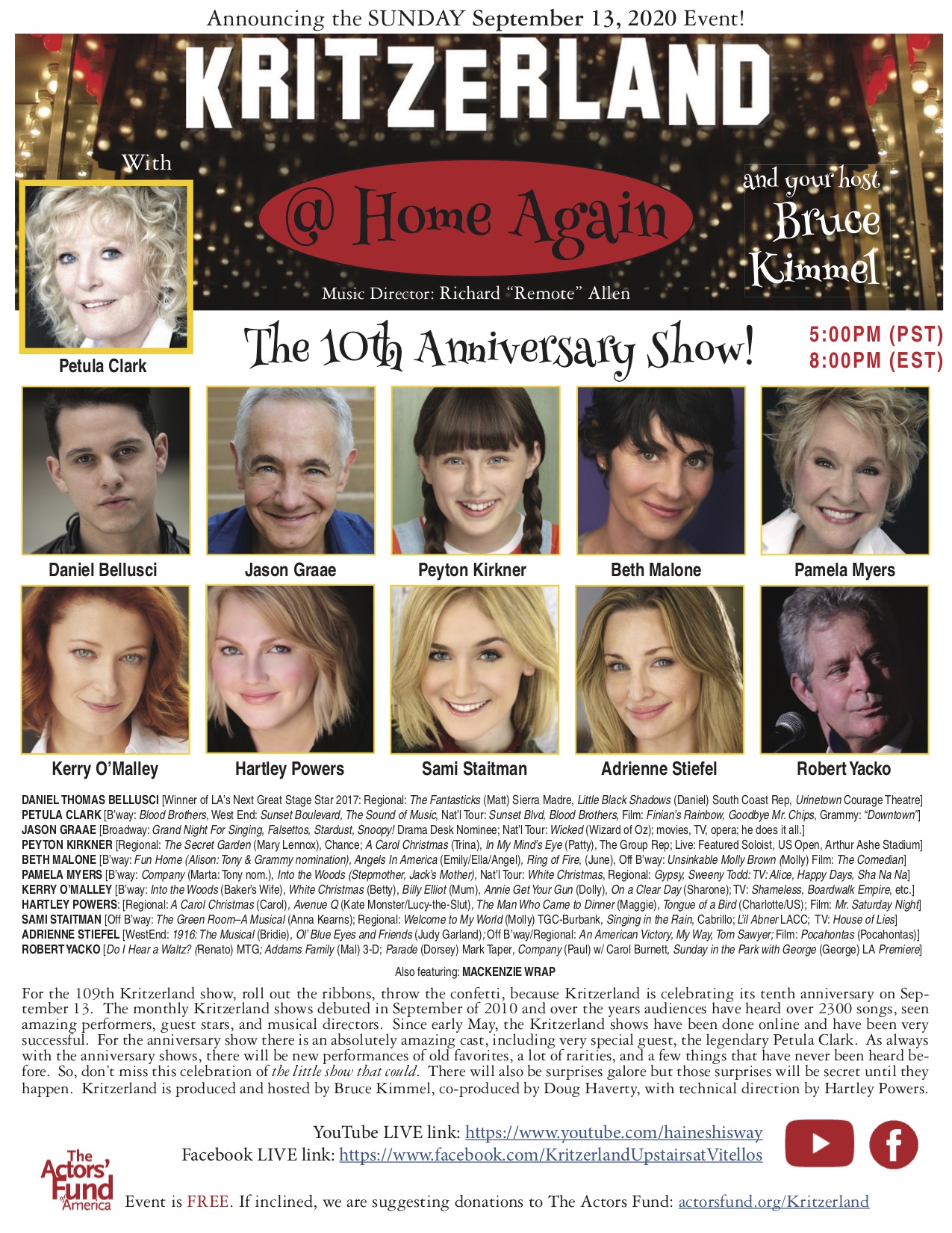 Well, dear readers, let me just say this about that: Yesterday was the day that was almost a musical. Yes, you heard it here, dear readers, yesterday was the day that was almost a musical. Now, what exactly do I mean by that rather obtuse sentence? Well, it’s simplicity itself – yesterday, it was 108 in the shade. If it had been two degrees hotter, we would have had us a musical – 110 in the Shade. It was so hot out that I never actually left the house until ten o’clock in the evening. Who wanted to be out in that heat? Not me, let me tell you. This is a record-breaking hot spell for this time of year. And we really need it to stop, so if anyone has any connections at all with the heat people, please have them give us some damn relief already. But the good news is that we changed the filter in the air conditioner – that should have been done six months ago and I think that was a lot of the cause of my allergy problems, all that dirt and dust that had gathered on the filter blowing into the house and directly on me. Otherwise, I’m just sitting here like so much fish, listening to Barbirolli do some Elgar, which is a good thing. In other news, here’s the flyer for the anniversary show on September 13 – what a cast and of course the four weeks of trying to land our performer legend paid off and there is a whole lot of excitement building up about it.