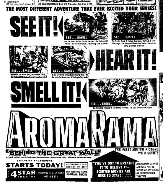 Well, dear readers, I must write these notes in a hurry, for she of the Evil Eye will be here all too soon and I got very little sleep and am overtired and I need some semblance of beauty sleep. There, I’ve said it and I’m glad. So, let me begin by saying I am sitting here like so much fish, listening to the Prokofiev opera, The Love of Three Oranges by Sergei Prokofiev, sung in French. This recording was recommended by our very own elmore and he likes the French version since that’s where the opera premiered. I’m enjoying it very much and the fun thing about Prokofiev is that his music doesn’t sound like anyone else’s. I gather the story is about the love of three oranges. I don’t particularly have love for even one orange. I’m one of the few people who find oranges weird – their flavor and the whole experience of eating one. They make me nervous. They squirt at inopportune moments, their pulpy, the have pits or seeds or whatever they are, but I will give them their due and say that they smell good. In fact, the week before I saw Scent of Mystery in Smell-O-Vision, I went to the 4 Star Theater and saw Behind the Great Wall, a documentary to which smells were hastily added so that it could beat Scent of Mystery to the screen, which, in L.A., it did. I vividly remember the opening of the film, which was a tacked-on prologue with Chet Huntley, talking about AromaRama and how we were going to smell the movie. He picked up an orange (I know you were wondering how this was all going to tie together) and cut it in half and suddenly the theater was alive with the smell of an orange. Unfortunately, that was the high point of the film. The blew the smells in through the air conditioning ducts. It wasn’t anywhere near the fun of Scent of Mystery, which used smells to actually tell the story. What the HELL am I talking about? Oh, yes, The Love of Three Oranges in AromaRama. For those who like visual aids, try this on for size.