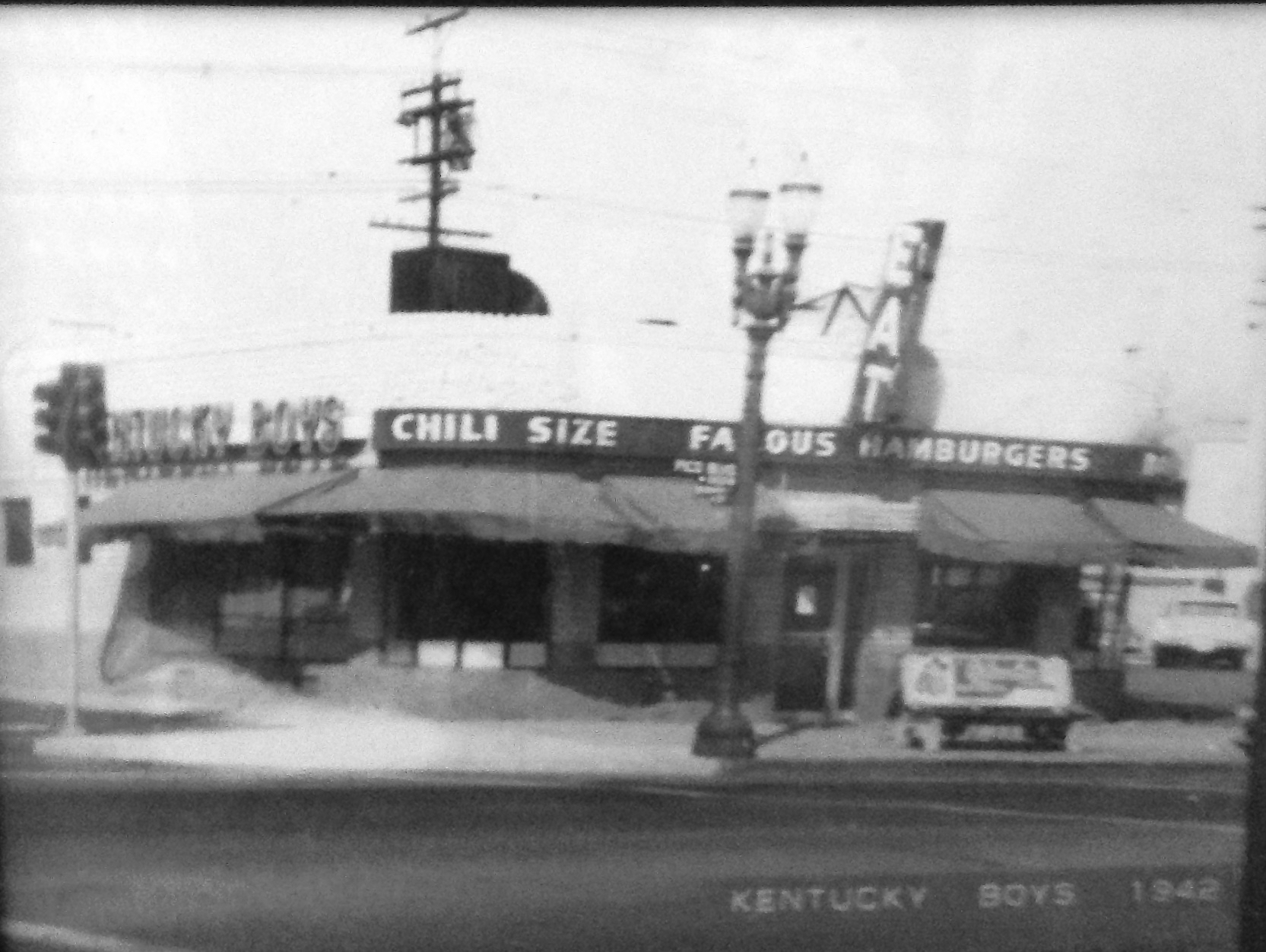 But last week, I got an e-mail from someone who’d found a mention of Kentucky Boys right here at haineshisway.com as well as the Peek Inside thing at Amazon for Benjamin Kritzer. Turns out his parents owned the building – not when it was Kentucky Boys, but after and long before it was rented out to the mortuary. Isn’t that funny? He’d read about the architect drawing here at haineshisway.com and asked if I could send him a photo, which I did, along with a photo of the matchbook. And he sent me what must be the only existing photo of it as Kentucky Boys, probably right from the time when I was seeing The Court Jester and The Man Who Knew Too Much, which came out the same year. And here for your visual delectation is said photo.