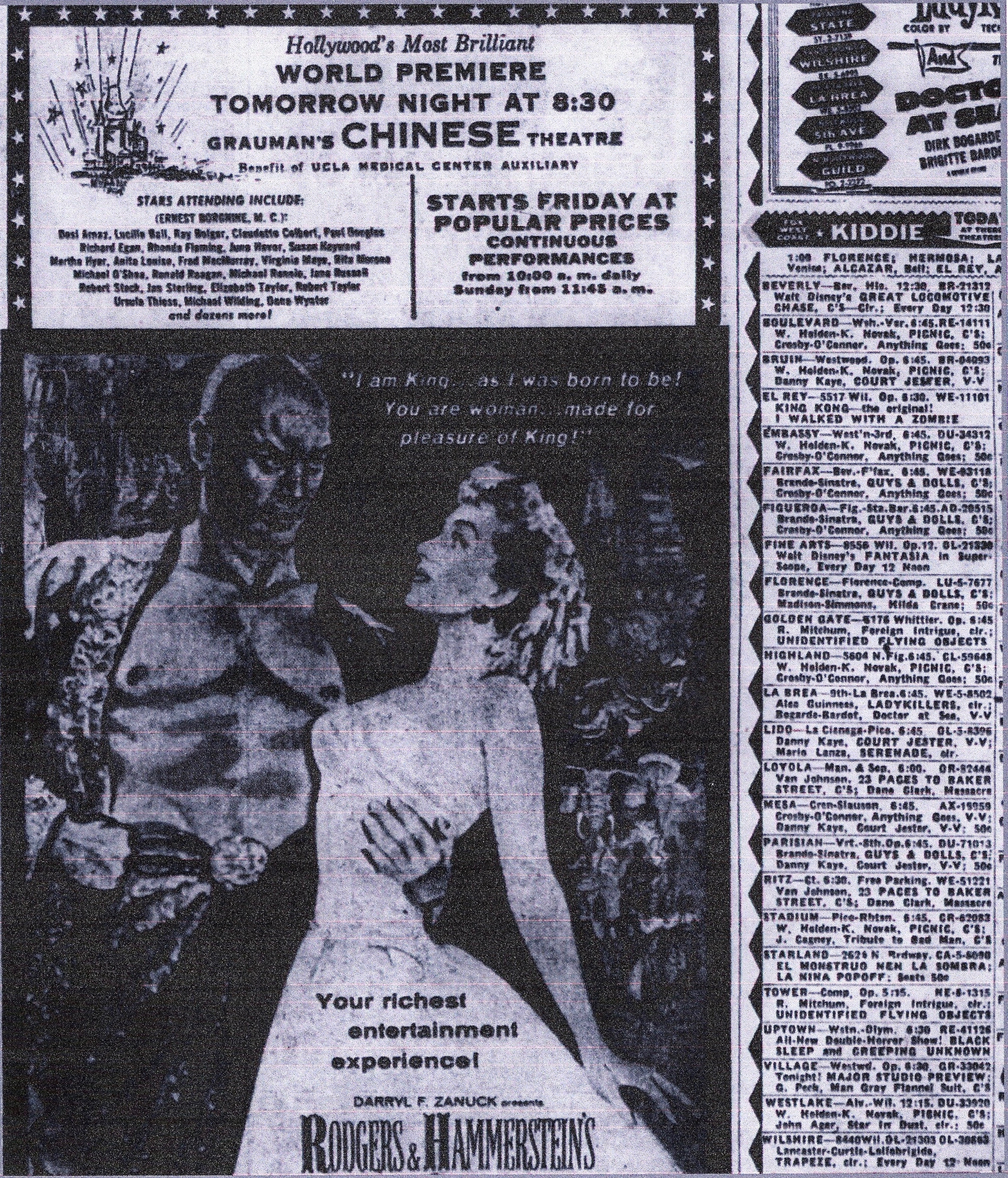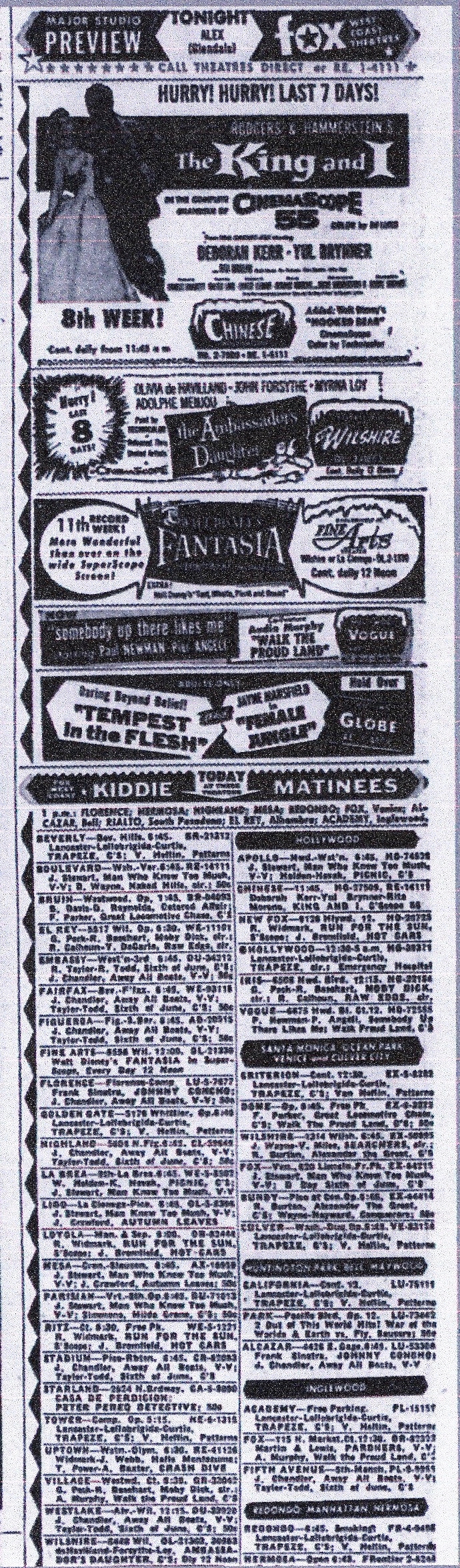 Well, dear readers, I am sitting here like so much fish, listening to William Alwyn’s opera of Miss Julie. This is my second go-through of it and I’m enjoying it more than I did for the first time, probably because I’m more in that opera mode than I was the first time. I’ve been an Alwyn fan ever since I heard his score for Gary Cooper’s final film, The Naked Edge. When Lyrita released its Alwyn conducts Alwyn series on LP I bought them all and loved them all. That series was heaven-sent. Then Chandos in the CD era did their own series, and I bought them all but wasn’t thrilled with either sound or performance. And then, finally, Lyrita began releasing CDs and the Alwyn CDs were in the first batch, I think. And those recordings are, for me, definitive in both performance and sound. Miss Julie has many wonderful, lyrical moments, some bombast that seems a bit perhaps too bombastic for the libretto, but Alwyn was a masterful composer and even when this isn’t quite working, it’s still very enjoyable. Up until recently, this was the only recording but along came Chandos and I have no interest in even hearing theirs.  Otherwise, I was pondering memory. Not the song from CATS, mind you, but actual memory. I have always felt I have a pretty perfect memory for my childhood and teen years.  I mean like pretty perfect. Writing the Kritzer books was like being there, like reliving all those things in great detail. There was not a single thing I didn’t remember for those books. But just to make sure, I went downtown to the main library and pulled out the microfilm for several years so I could make sure I saw what I saw where I remembered seeing it, and I was never wrong. Of course, today we have newspapers.com and that’s been fun finding stuff there. My memory did fail me on two films that I was positive I saw at the Village Theater in Westwood – The High and the Mighty and The Tender Trap (in the downtown library visit, I never pulled those rolls of microfilm). Well, I had the Westwood part right, but not the theater – both films played the Picwood and that’s where I saw them, I guess, but boy was I sure it was the Village, right down to being able to visualize sitting there. And while I haven’t looked at every week subsequent to the Picwood showings, I cannot imagine they would have played the Picwood and somehow moved to the Village. But as to movies that played at my three neighborhood houses, those I was never wrong about. I got worried at one point in my library visit that I was misremembering the double bill that adorns the cover of Benjamin Kritzer – The Man Who Knew Too Much and Autumn Leaves, although that double bill was seared into my memory. But the first week The Man Who Knew Too Much played there it had a different second feature, but a week later, when I saw it, it was indeed Autumn Leaves. That was the Lido Theater – and here’s the proof, which is on the page rather than in the pudding.