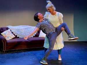 The Actors Nightmare is probably the best known of this quartet of one-acts since it was so frequently coupled with Durang’s controversial hit Sister Mary Ignatius Explains It All for You. A hapless actor, George Spelvin (James Everts), or is he really an accountant, finds himself as the understudy forced to go on in a leading role for which he has had no rehearsal. Are they doing Noel Coward’s Private Lives or Samuel Beckett’s Endgame or A Man for All Seasons ? Or all three which will really end the game for Spelvin when the executioner lops off his head. Sometimes the stage manager (Bonebright-Carter) is helpful and gives Spelvin his line, other times she doesn’t as the poor actor screams Stella as well as Line over and over.