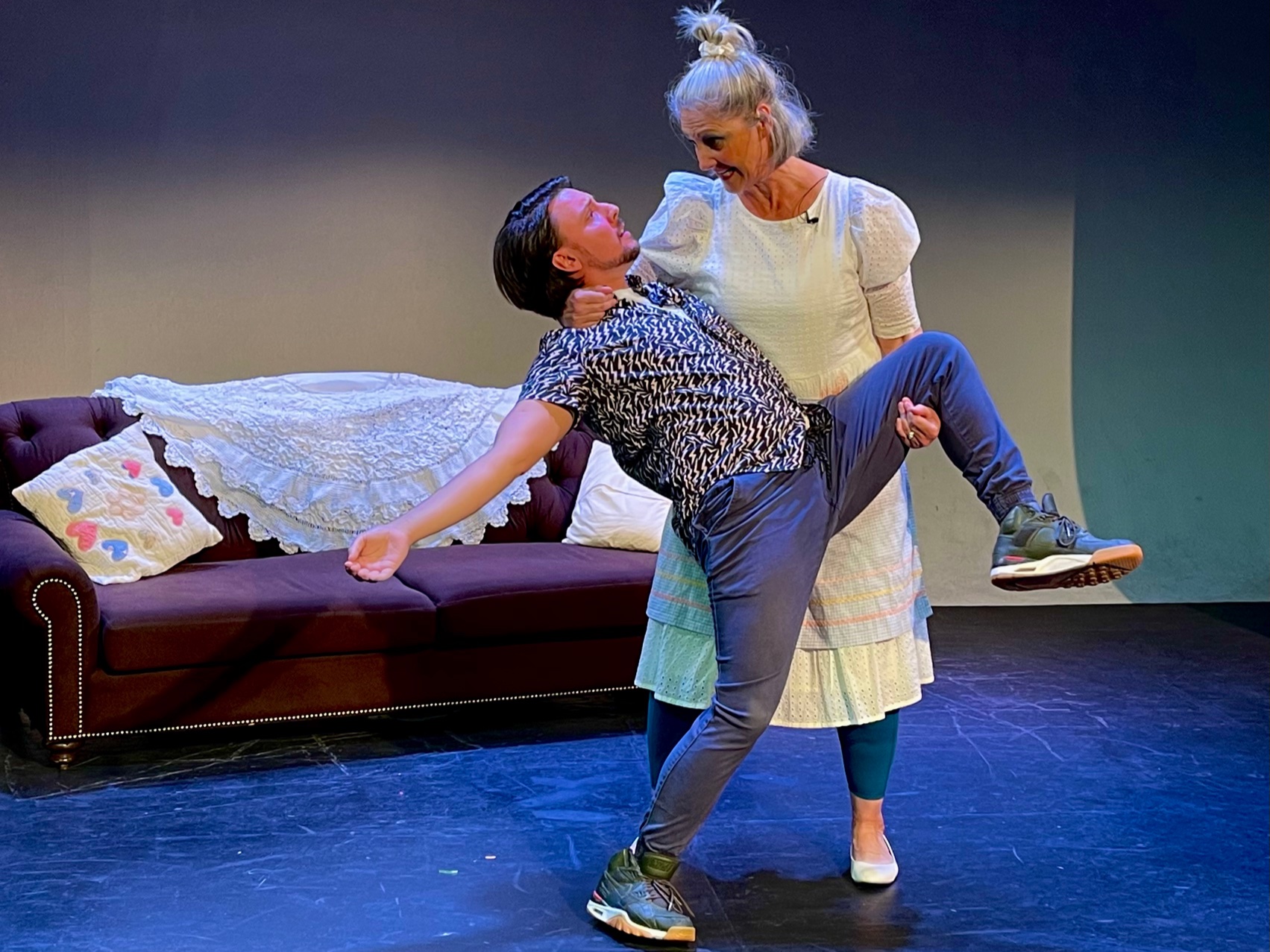 In Wanda’s Visit, a contented 13-year married couple Jim (Neil Unger) and Marsha (Jen Talton) have their lives disrupted when an old high school friend of Jim’s arrives. Wanda (Mullen) is a force of nature, a non-stop talking whirling dervish with a definite letch for Jim whom she says was hot for her in high school. Jim remembers it differently but that doesn’t stop Wanda from nearly destroying his marriage. Wanda talks day and night, even crawling into the couples’ bed, revealing all her secrets—her promiscuousness in college, her multiple husbands, her herpes, her facial surgery and time in witness protection, etc. Jim seems flattered by the attention but Marsha is soon at the end of her rope and a fishbone may be the answer to her prayers. Can this marriage survive? Mullen steamrolls his way through this scene with energy to spare. Unger makes a good straight man.