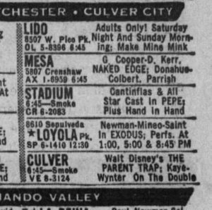 Well, dear readers, I am sitting here like so much fish, listening to George Duning’s wonderful score to The Devil at 4 O’Clock, a motion picture starring Frank Sinatra and Spencer Tracy. This is one of many motion pictures that I remembered seeing at my beloved Stadium Theater, but like another that I remember, The Manchurian Candidate and another, Breakfast at Tiffany’s, the Stadium had already closed. So, I saw each of those elsewhere. Funny thing, memory. The Stadium closed with no warning on September 5, 1961. Their final double bill was, surprisingly, two films I loved but had already seen several times – of course, had I known it was closing I would have gone, but I went to other movies that weekend. And that final double bill? Pepe and Hand in Hand. I do remember opening the paper on September 6, as I always did, to check the new movies, and was shocked to see no Stadium where there was always a Stadium in Fox West Coast Theaters. I walked over there immediately and saw the closed sign. I was devastated. It’s all there in the third Kritzer book, Kritzer Time, chapter four to be exact. And while I guessed at the time frame (I didn’t put the exact date), I say I’d just started ninth grade, which is the exact time it closed. Funny thing, memory. In any case, the last film I saw at the Stadium was one month prior to its closing, and that was The Naked Edge. They played two thing after that and prior to their final double bill – By Love Possessed and a second feature, and a revival of Gone With the Wind, neither of which interested me, mostly because I’d had to go to summer camp and when I returned I was busy catching up on motion pictures, but repeatedly so with The Parent Trap and then the general release of Exodus.  Here are the September 5 and September 6 newspaper listings – gone with the wind indeed, from one day to the next.