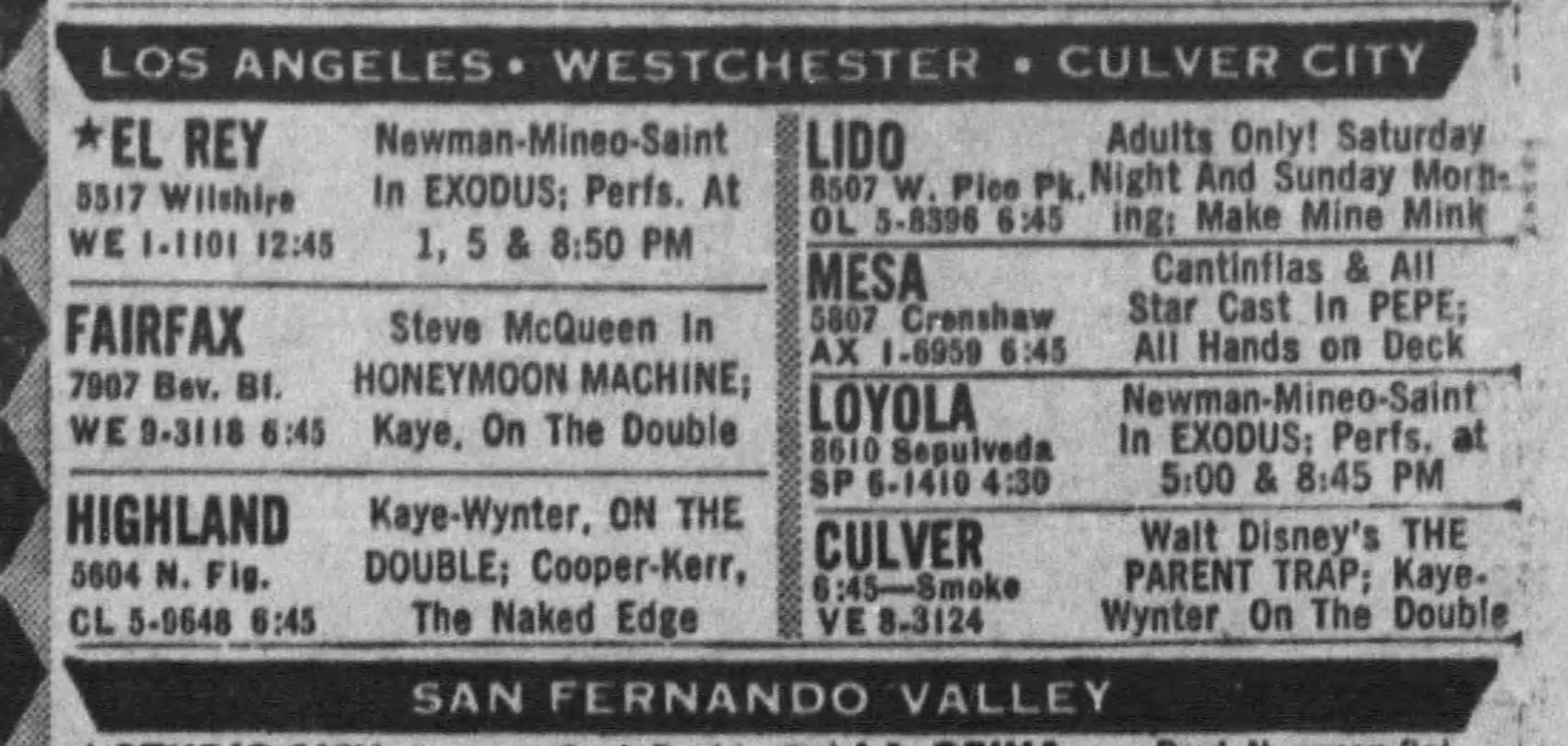 Well, dear readers, I am sitting here like so much fish, listening to George Duning’s wonderful score to The Devil at 4 O’Clock, a motion picture starring Frank Sinatra and Spencer Tracy. This is one of many motion pictures that I remembered seeing at my beloved Stadium Theater, but like another that I remember, The Manchurian Candidate and another, Breakfast at Tiffany’s, the Stadium had already closed. So, I saw each of those elsewhere. Funny thing, memory. The Stadium closed with no warning on September 5, 1961. Their final double bill was, surprisingly, two films I loved but had already seen several times – of course, had I known it was closing I would have gone, but I went to other movies that weekend. And that final double bill? Pepe and Hand in Hand. I do remember opening the paper on September 6, as I always did, to check the new movies, and was shocked to see no Stadium where there was always a Stadium in Fox West Coast Theaters. I walked over there immediately and saw the closed sign. I was devastated. It’s all there in the third Kritzer book, Kritzer Time, chapter four to be exact. And while I guessed at the time frame (I didn’t put the exact date), I say I’d just started ninth grade, which is the exact time it closed. Funny thing, memory. In any case, the last film I saw at the Stadium was one month prior to its closing, and that was The Naked Edge. They played two thing after that and prior to their final double bill – By Love Possessed and a second feature, and a revival of Gone With the Wind, neither of which interested me, mostly because I’d had to go to summer camp and when I returned I was busy catching up on motion pictures, but repeatedly so with The Parent Trap and then the general release of Exodus.  Here are the September 5 and September 6 newspaper listings – gone with the wind indeed, from one day to the next.