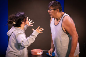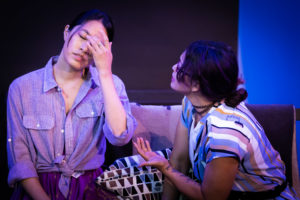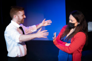 Ashley (Courtney Sara Bell) is engaged to Lana (Leah Verrill) and, although a liberal vaccinated lesbian, she is consumed by irrational Covid conspiracy theories. She refuses to leave their apartment, even to attend the memorial service for her 92-year-old grandmother who recently died of Covid. She refuses to see or even talk to her brother Will (Michael J. Lutheran), who flew in from Dallas for the ceremony, because he voted for Trump twice. Estranged brother and sister finally do confront each other and air their political differences in one of the play’s strongest scenes.