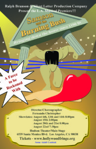 The Hollywood Fringe Festival is back after taking off year 2020 like most public events due to Covid-19. It’s two months removed from its usual June dates and its scaled down in size. There were usually 300 plus shows crammed into a very busy month. This year there are a lot less offerings and many of them besides being live are also being shown in Virtual Performance while others can only be seen virtually. For the live shows proof of Covid vaccination or a recent test result are required plus the wearing of a mask in the theatre. The shows seem to fall into the usual Fringe categories of the good, the bad, the ugly and the indifferent. Unfortunately, I began my 2021 Fringe-going with the bad—a biblical mishmash entitled Samson and the Burning Bush. It is one of those shows where the audience should be advised to leave their brain at the ticket window. How bad was it? Let me count the ways: