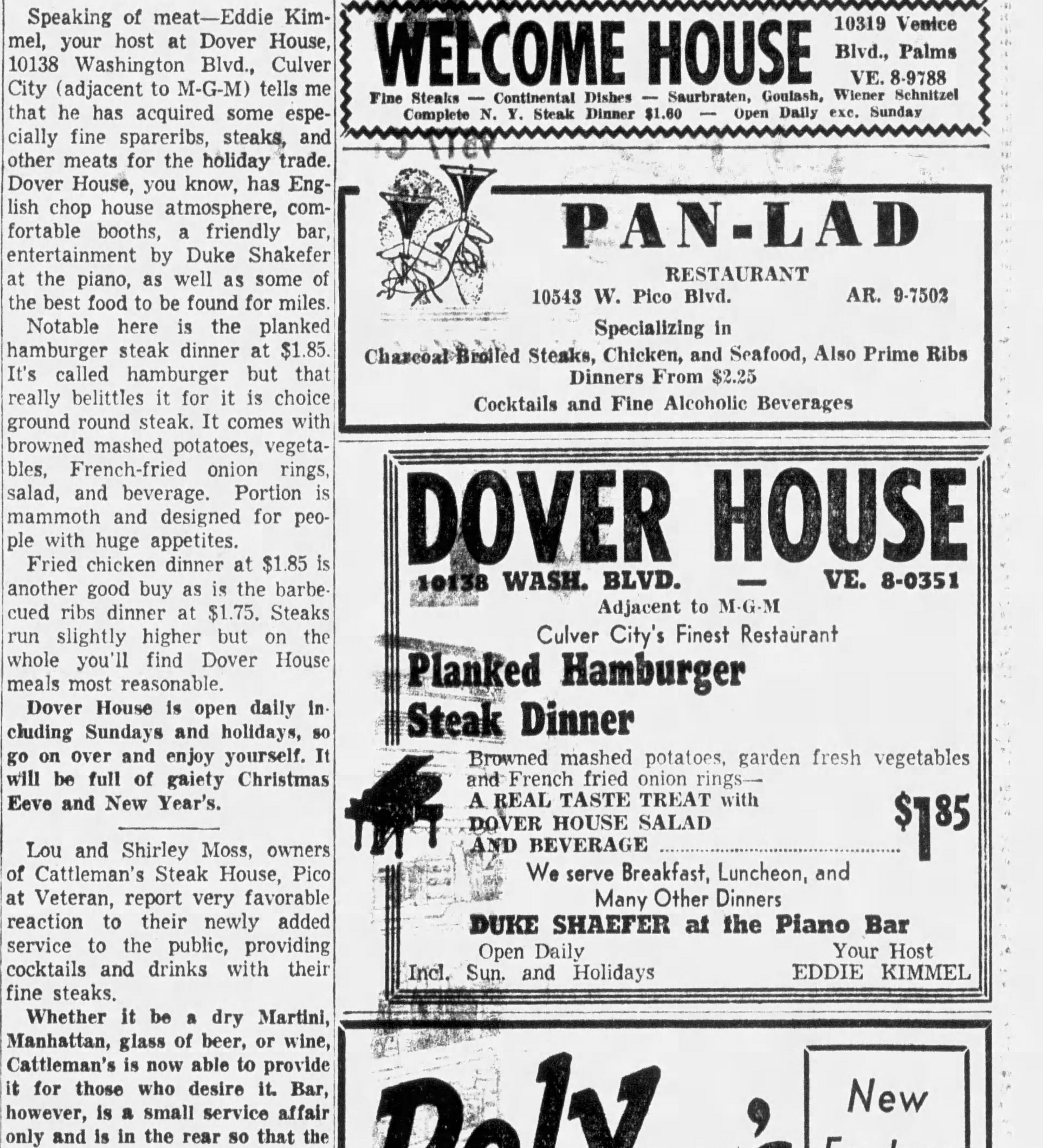 Finally, I’ve never been able to find any information about a restaurant my father had something to do with in Culver City. We went there several times – it was “The Home of the Planked Hamburger Steak” and called The Dover House. I never really knew where it was. Well, I found it and it was right next to MGM on Washington Boulevard. In fact, that location is now a modern office building for Sony. But I didn’t know that he was the host there in its early days – you know, host/owner. Here’s a little advert and story.