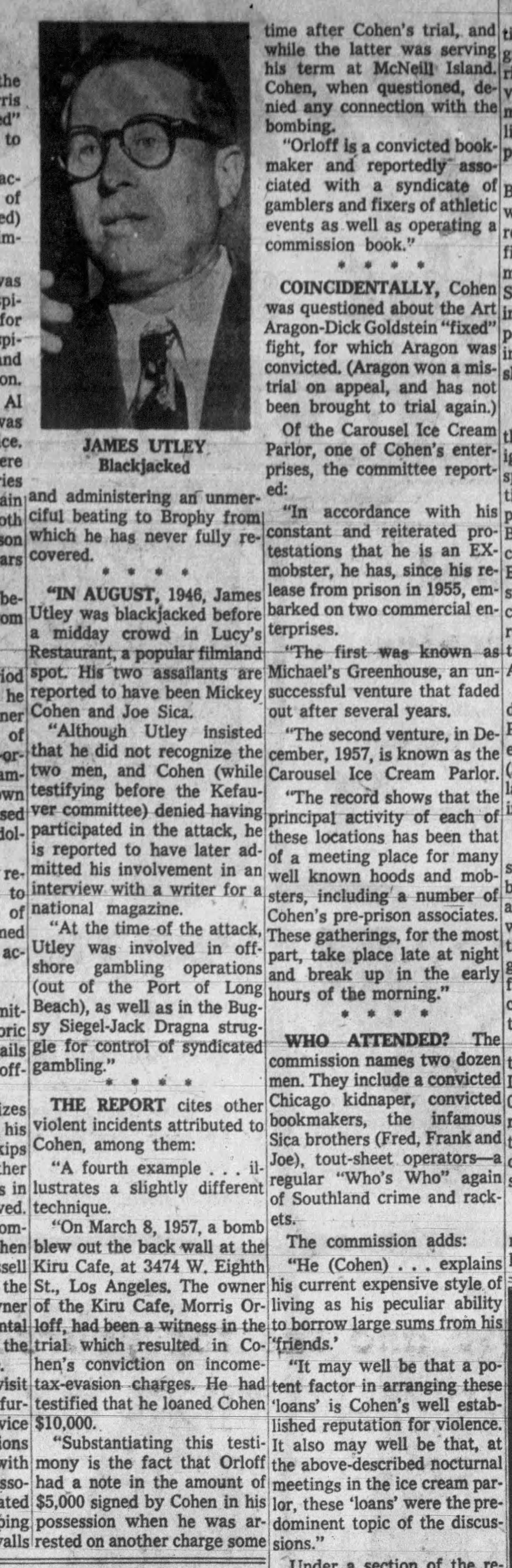 Crazy, no? One of the first things I found when searching his restaurant was some crazy story from 1957, that a bomb had gone off in the back of the restaurant, outside the rear door where the parking lot was. There were no suspects or anything. But I found a subsequent story from a few years later that posited who was responsible and why it was done. Is that not wacky? Well, it gets wackier because who they think did it was the one and only notorious gangster, Mickey Cohen. The reason? Well, my father’s business partner testified against him at his trial. And who was that? One Morris Orloff. Yes, the father of our very own Penny Orloff.